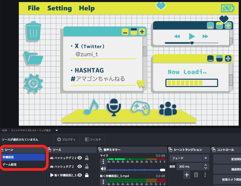 シーンは色々作っておくと、ゲーム配信と雑談配信の画面を切り替えたり、