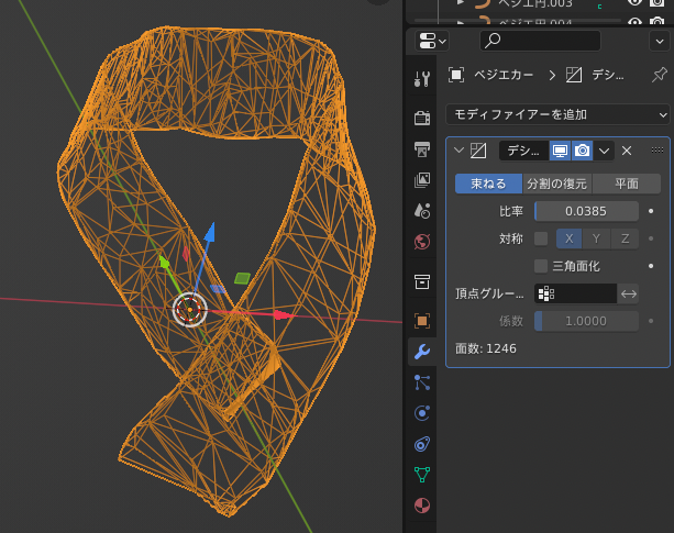オブジェクトモード>モディファイア>デシメートでこんな感じに減らしました。