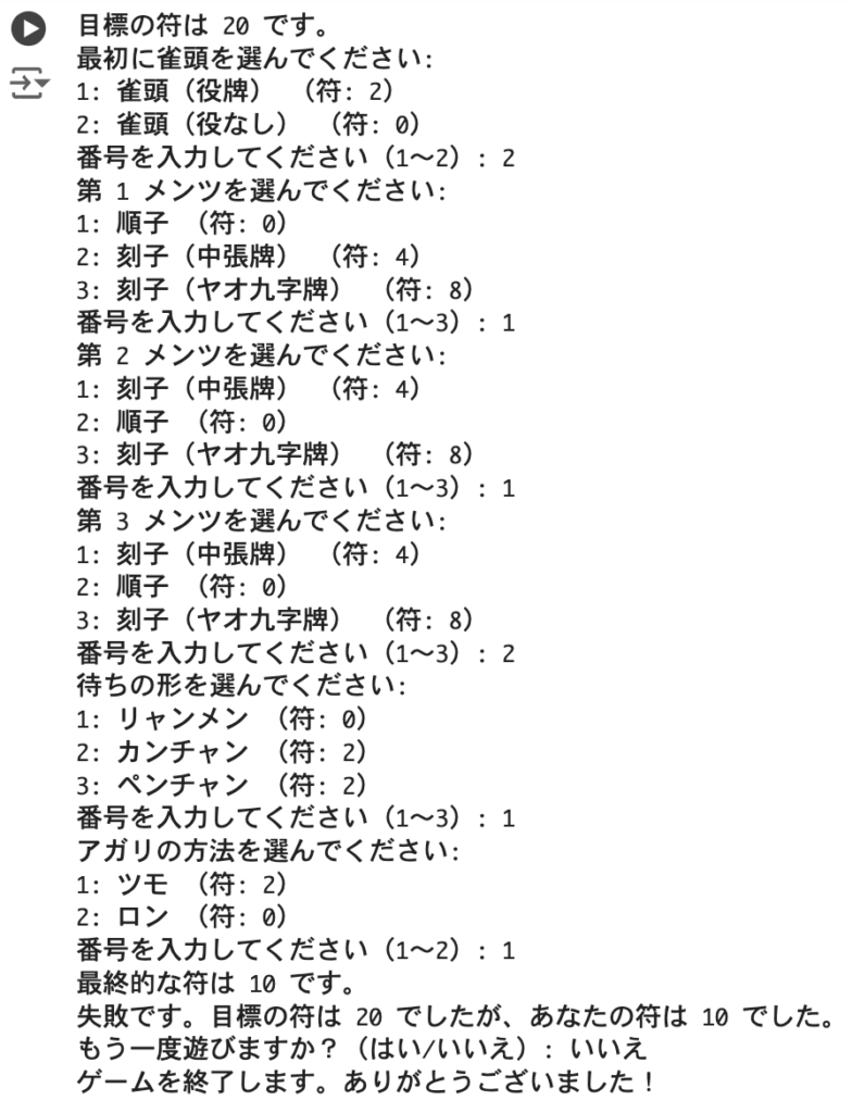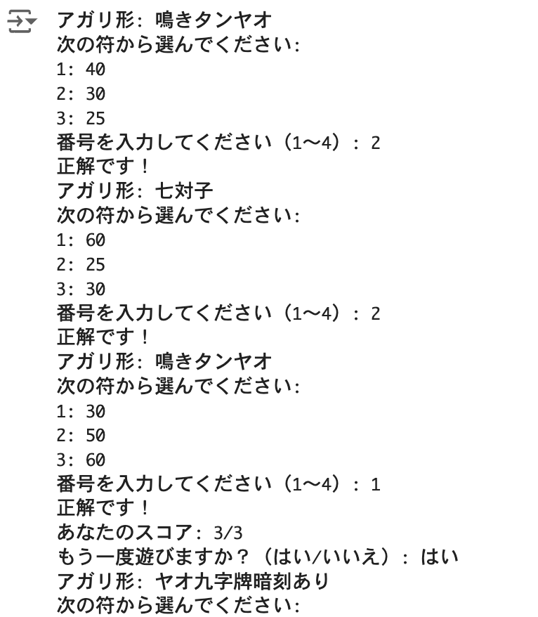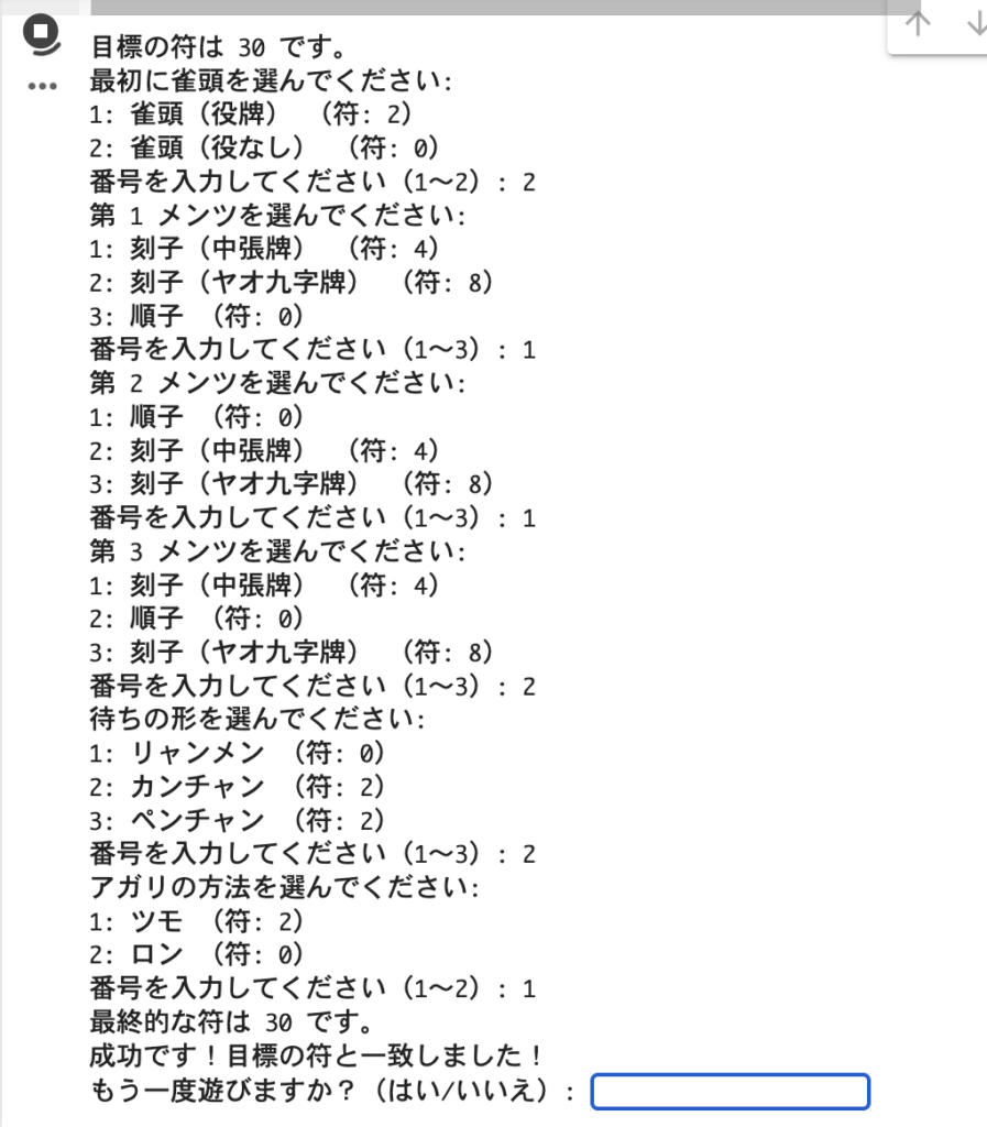 replay = input("もう一度遊びますか?(はい/いいえ): ").strip().lower()