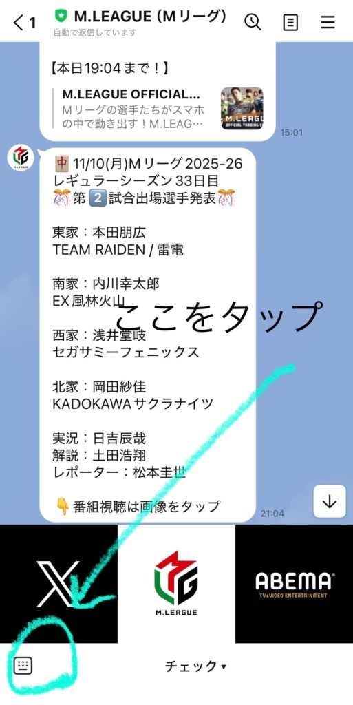 ①MリーグLINE公式アカウント( http://nav.cx/2cdpHvu )をフォローする。