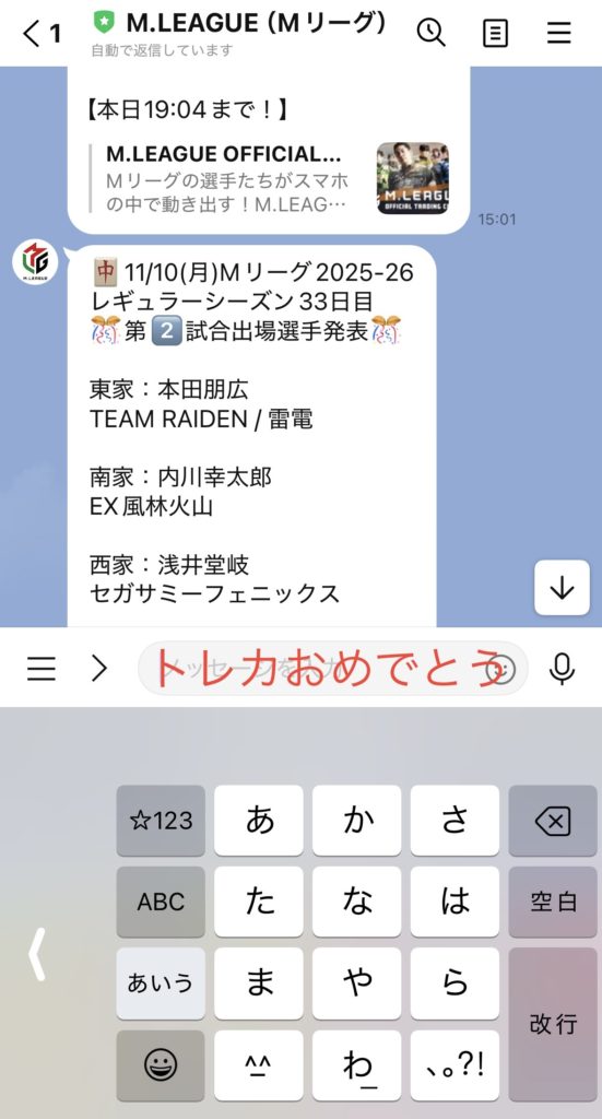 ②「トレカおめでとう」とメッセージを入力し、送信する。