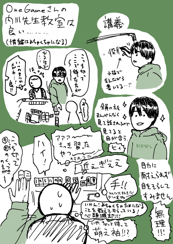 その後、一番手前の卓が一番ホワイトボード=講師の先生に近いことを知り、激しく後悔しました。内川プロのファンすぎて正気を保つのが難しいからです。
