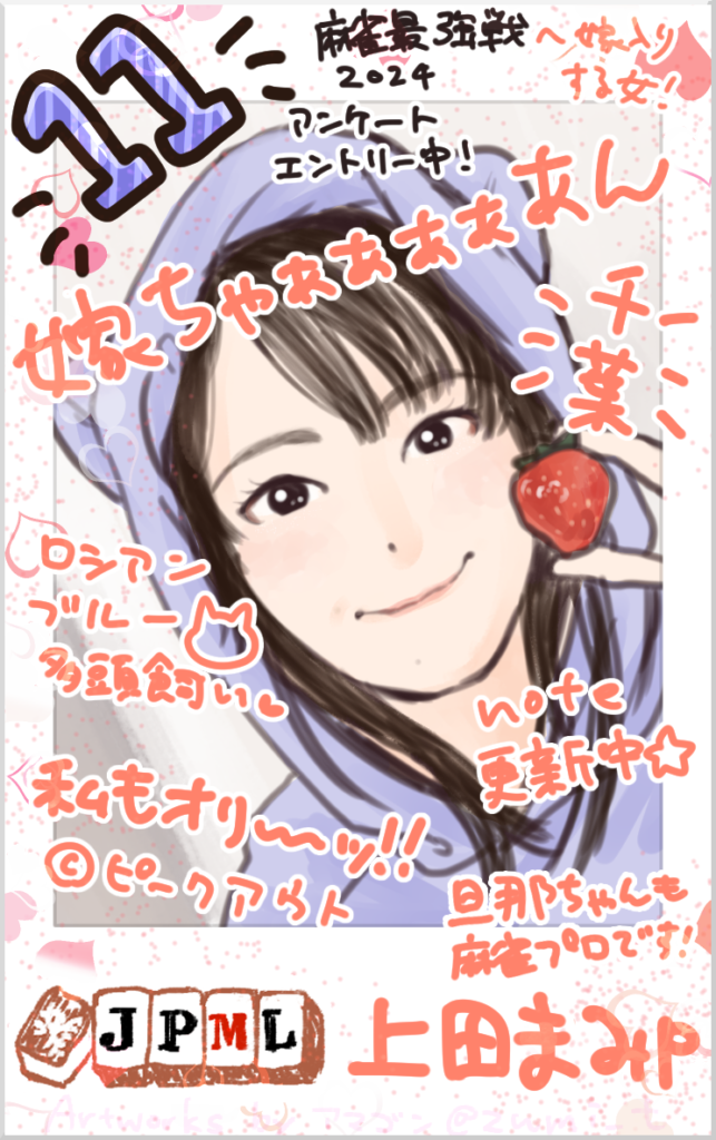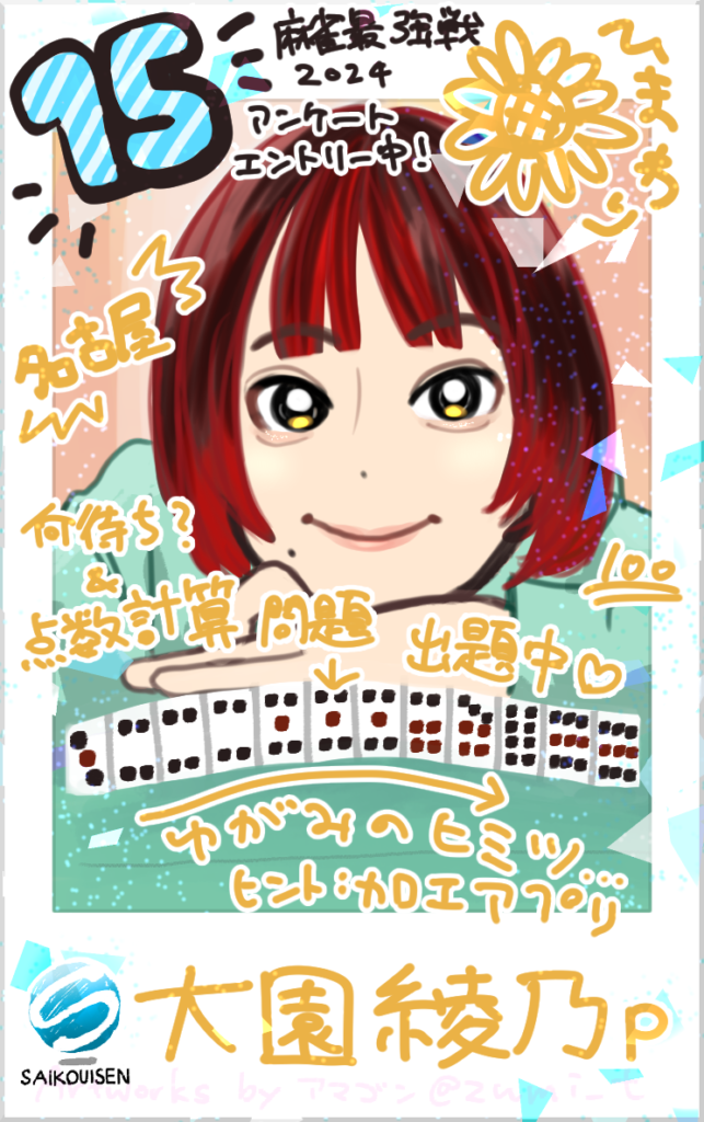 麻雀最強戦2024読者投票 応援イラストまとめ イラスト X Facebook はてブ Pocket LINE コピー 2024.11.05 *ファンアートはご本人様と権利者様はサムネ等使用フリーです。詳しくはこちらをご覧ください。*投票はすでに終了しています。告知サイトはこちら。 ※すべてご本人様以外の無断転載禁止です。 ご本人様で、掲載取り下げをご希望される場合は、X(旧Twitter)のDMか、こちらのフォームからご連絡ください。 似顔絵作成など、お仕事の依頼はこちらをご覧ください。 麻雀ファンアートまとめサクラナイツ多めに色々 だいたい時系列順に並んでます。*ファンアートはご本人様と権利者様はサムネ等使用フリーです。詳しくはこちらをご覧ください。⬆️こちらの動画()を元にしたイラストです。第二弾のサムネにイラストをつかっていただきました!感... 麻雀ファンアートまとめ2Mリーガー多めに色々*ファンアートはご本人様と権利者様はサムネ等使用フリーです。詳しくはこちらをご覧ください。 推しコンビ チーム西とくまごー石井良樹プロ頼さくらプロKONAMI麻雀格闘倶楽部ののれんをめぐる攻防が好きすぎるマンガ元ネタの動...