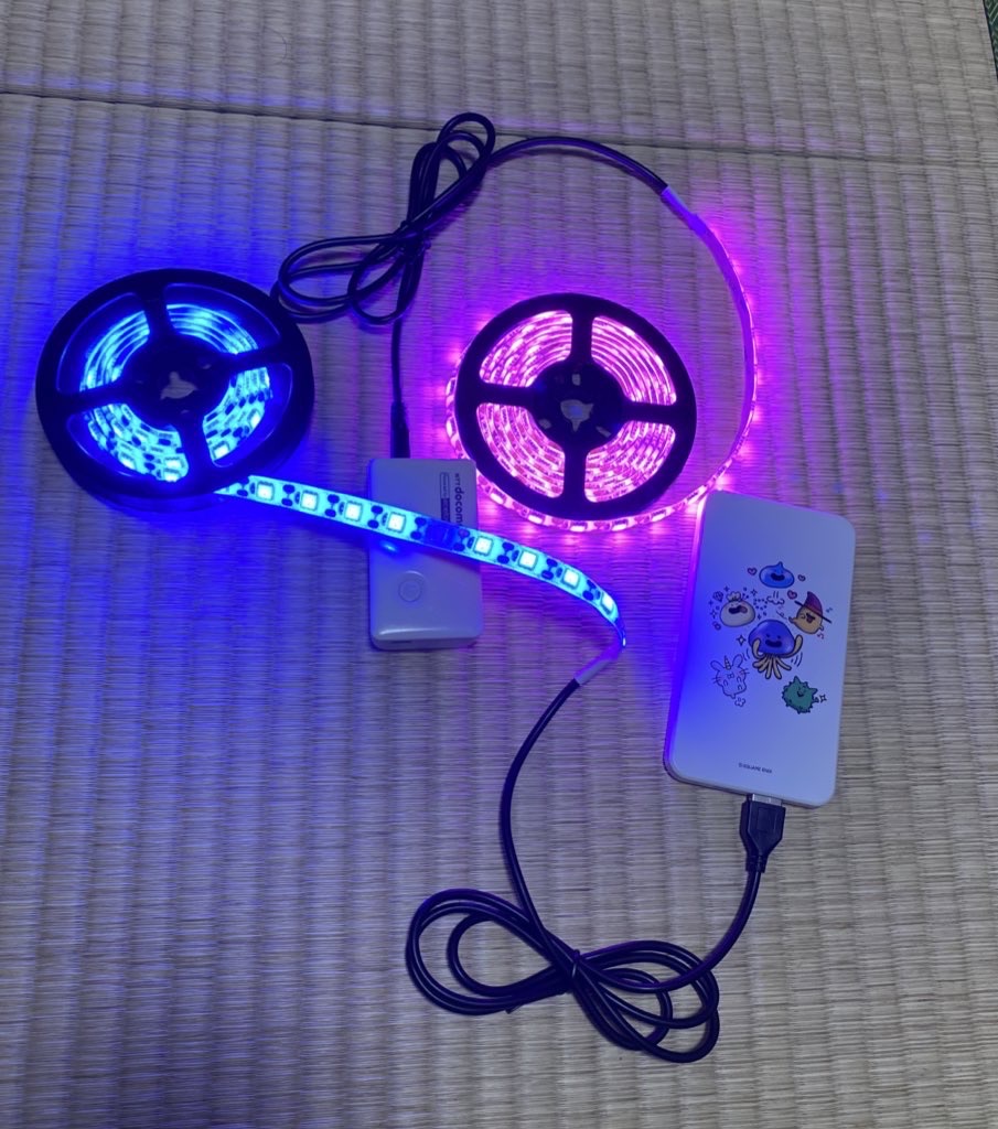 ちなみに、USBで光るタイプなので、モバイルバッテリーにより電源の確保が容易でした。
