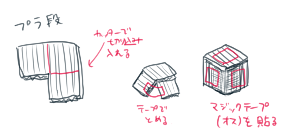 最大の難関、着脱です。マジックテープ(面ファスナー)の結束バンドで固定する予定だったのですが、箱をバラして組み立てる時にいちいち使っているとキリがありません。