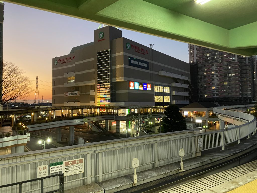 やっと入れたユーカリが丘線、ユーカリが丘駅のホームから見えるのは商業施設「ユーカリプラザ」。山万王国はもう始まっています。